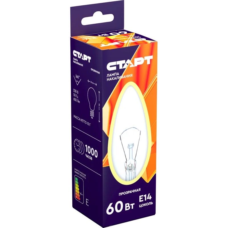 ЦЕНА Лампа СТАРТ Накаливания Е14 60Вт Колба свеча /10/50
